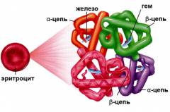 В каждом эритроците содержится около 30 пикограмм (пг) гемоглобина, что соответствует примерно 300 миллионам молекул. Молекула гемоглобина состоит из двух альфа (а1 и а2) и двух бета (b1 и b2) цепей глобина, формируемых из аминокислот в определенной последовательности. В каждой цепи находится молекула гема с атомом железа.
