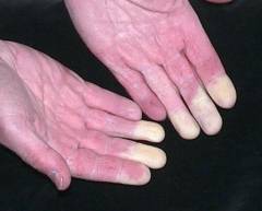 Фото: поражение кожи ладоней при системной красной волчанке. У пациентки утолщены суставы на фалангах пальцев, что указывает на артрит.