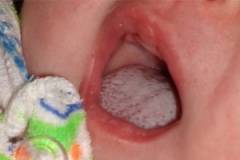 Острый кандидоз проявляется белым налетом, который легко снимается, под ним – воспаленная слизистая. У детей может вызывать плаксивость и раздражительность.