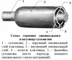 Синовиальное влагалище состоит из двух слоев цилиндрического эпителия, образующих капсулу. Первый слой плотно охватывает сухожилие, второй покрывает первый. Между слоями находится синовиальная жидкость, увлажняющая соприкасающиеся поверхности. При движении сухожилия трение происходит между слоями влагалища, а синовиальная жидкость служит смазкой, уменьшая силу трения. Это снижает риск повреждения тканей и вероятность реактивного воспаления как самого сухожилия, так и окружающих его структур.