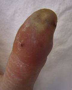 Второй путь проникновения инфекции — распространение изнутри организма, например, при остеомиелите фаланг пальцев. Характерной особенностью является образование свищей, через которые распространяется гной. Сухожильные капсулы, расположенные близко к кости, поражаются в первую очередь. Инфицирование синовиального влагалища через кровь из отдаленного очага инфекции, например, абсцесса печени, встречается редко и трудно диагностируется. В таких случаях на первый план выходят жалобы на первичный очаг и метастазы инфекции.