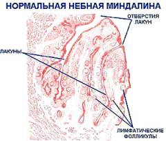 В глубь небных миндалин проникает до 20 углублений (крипт), которые разветвляются, образуя полости, выстланные эпителием. В криптах находятся фагоциты, микроорганизмы, отмершие эпителиальные клетки и иногда частицы пищи. Очищение лакун от содержимого обычно происходит во время глотания, но иногда этот процесс нарушается, и в просвете крипт образуются гнойные пробки.