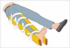 - Иммобилизация – зафиксируйте травмированную ногу. Подойдут палки или арматура, обмотанные бинтом. Можно примотать поврежденную конечность к здоровой. Ногу следует оставить в положении, в котором она оказалась после травмы.
