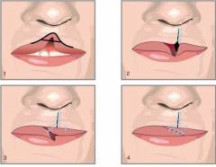 - Метод треугольного лоскута. Использует треугольные лоскуты для коррекции, позволяя добиться удлинения тканей и симметричной формы губы, но может привести к поперечному рубцу.